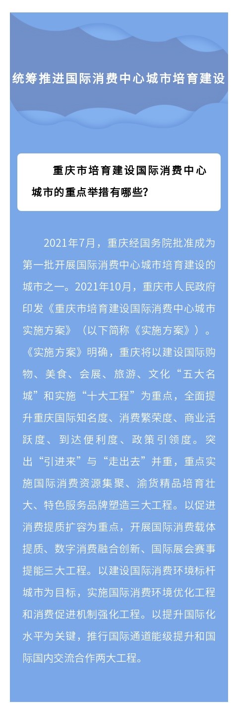 答:2021年7月,重庆经国务院批准成为第一批开展国际消费中心城市培育建设的城市之一。2021年10月,重庆市人民政府印发《重庆市培育建设国际消费中心城市实施方案》(以下简称《实施方案》)。《实施方案》明确,重庆将以建设国际购物、美食、会展、旅游、文化“五大名城”和实施“十大工程”为重点,全面提升重庆国际知名度、消费繁荣度、商业活跃度、到达便利度、政策引领度。突出“引进来”与“走出去”并重,重点实施国际消费资源集聚、渝货精品培育壮大、特色服务品牌塑造三大工程。以促进消费提质扩容为重点,开展国际消费载体提质、数字消费融合创新、国际展会赛事提能三大工程。以建设国际消费环境标杆城市为目标,实施国际消费环境优化工程和消费促进机制强化工程。以提升国际化水平为关键,推行国际通道能级提升和国际国内交流合作两大工程。