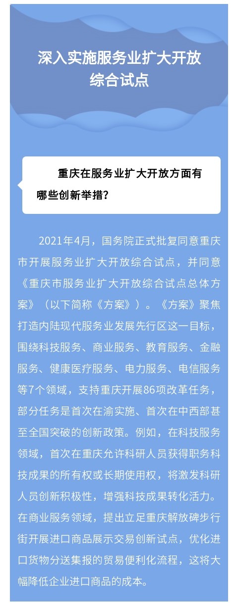 答:2021年4月,国务院正式批复同意重庆市开展服务业扩大开放综合试点,并同意《重庆市服务业扩大开放综合试点总体方案》(以下简称《方案》)。《方案》聚焦打造内陆现代服务业发展先行区这一目标,围绕科技服务、商业服务、教育服务、金融服务、健康医疗服务、电力服务、电信服务等7个领域,支持重庆开展86项改革任务,部分任务是首次在渝实施、首次在中西部甚至全国突破的创新政策。例如,在科技服务领域,首次在重庆允许科研人员获得职务科技成果的所有权或长期使用权,将激发科研人员创新积极性,增强科技成果转化活力。在商业服务领域,提出立足重庆解放碑步行街开展进口商品展示交易创新试点,优化进口货物分送集报的贸易便利化流程,这将大幅降低企业进口商品的成本。
