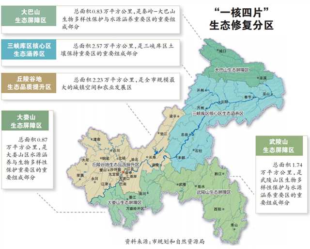 长江两岸青山·千里林带建设、三峡库区山水林田湖草生态保护修复、巫山一七曜山水土流失和石漠化综合治理、方斗山一七曜山生物多样性保护
