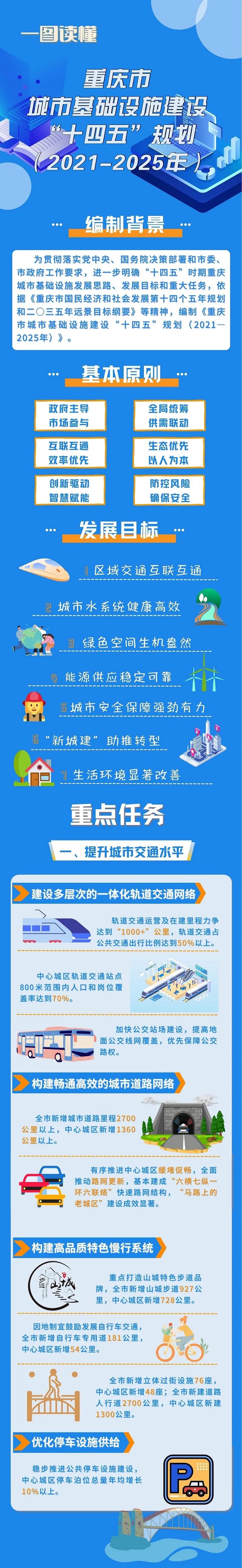 近日,重庆市人民政府印发了《重庆市城市基础设施建设“十四五”规划(2021—2025年)》(以下简称《规划》),进一步明确了“十四五”时期重庆城市基础设施发展思路、发展目标和重大任务。《规划》要求,“十四五”时期重庆“轨道上的都市区”“1小时通勤圈”建设取得关键进展。