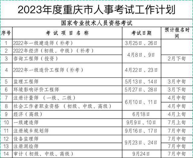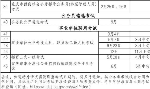 重庆市人力社保局相关负责人提醒各位考生,如遇特殊情况需要调整考试日期的,将另行通知。其中各项考试报名时间为预估时间,具体报名时间及考试要求请查阅各项考务文件,考生可登录重庆人事考试专栏查询。