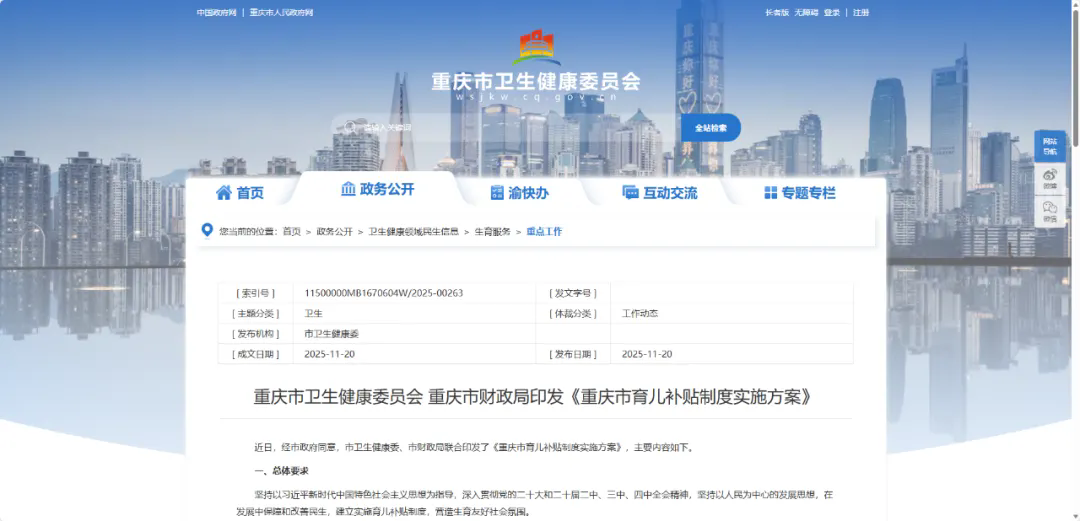 近日,经市政府同意,市卫生健康委、市财政局联合印发了《重庆市育儿补贴制度实施方案》,主要内容如下↓↓