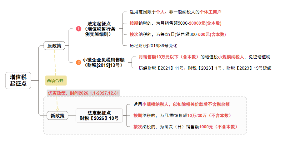 之前,国税2019年第4号和2023年1号公告中,均明确了“小规模纳税人扣除本期发生的销售不动产的销售额后未超过10万元的,其销售货物、劳务、服务、无形资产取得的销售额免征增值税”。同时,小规模纳税人销售不动产适用5%征收率(与其他应税交易3%征收率不同),形成了“不动产销售额单独计税”的特殊规则。新政策财税2026年10号公告统一了小规模纳税人征收率(不动产销售也为3%),消除了不同应税交易的征收率差异。因此在判断是否达到起征点时,销售不动产的销售额就必须与其他销售额合并计算,不再允许单独扣除。5、起征点计算口径按“差额后”计算