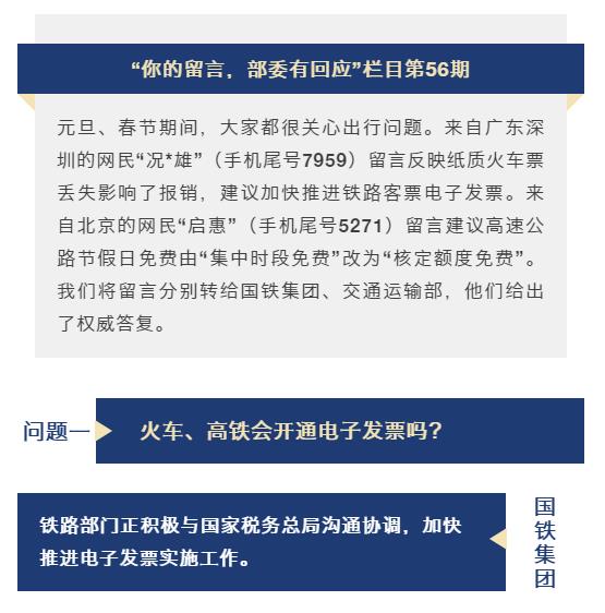 来自广东深圳的网民“况*雄”(手机尾号7959)说: 回深圳的火车票报销凭证不小心丢失,找了几圈没找回,后续没法找公司报销,只能自己承担。想问下火车高铁能实现电子发票么?现在必须取纸质报销凭证,丢失后还没法补办,出差的普通员工只能自认倒霉。刷身份证进站的便利被取报销凭证给耽误,希望能加速推进火车票电子发票,便利老百姓出行,谢谢!